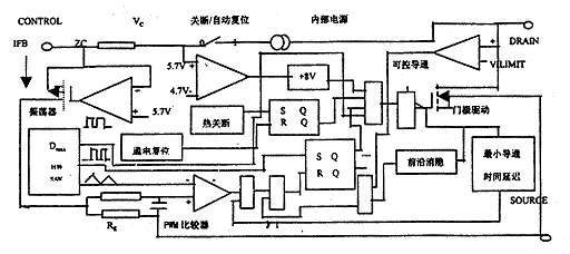 2.2 芯片内部工作原理介绍 芯片内部工作原理框图如图1所示。该芯片由MOSFET.PWM控制器、高压启动电路环路补偿和故障保护电路等部分组成。具体工作过程如下:在控制端环路振荡电路的控制下,漏极端有电流输入芯片提供开环输入,该输入通过并联稳压运放误差放大器时,由控制端进行闭环调整,改变IFB,经PWM控制MOSFET的输出占空比,最后达到动态平衡。
